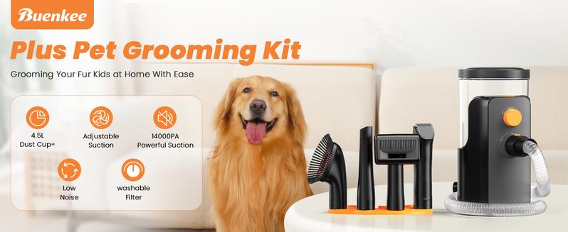 Buenkee Dog Grooming Vacuum, 4.5L Extra-Large Dust Cup Dog Grooming Kit, 14000Pa High-Suction Pet Groomer with Clippers, Low-Noise All-In-One Shedding Control Set for Home Use
