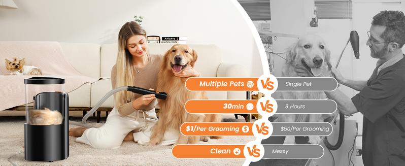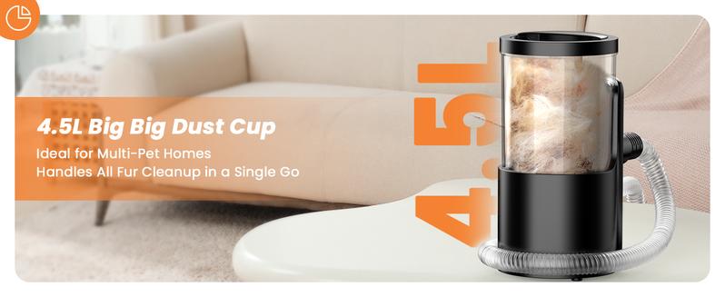 - 4.5L - The Industry's Premier Capacity for Ultra-Convenient Storage: Equipped with a detachable 4.5 L dust box, which is 200% larger than the common 1.5L of most competitors. Specially crafted for busy families with multiple pets, it eliminates the need for frequent emptying during the grooming process, thus saving more precious time. The quick-release lid enables effortless cleanup, and the included storage board keeps accessories neatly arranged. Enjoy the peak of grooming convenience and a worry-free pet care routine!