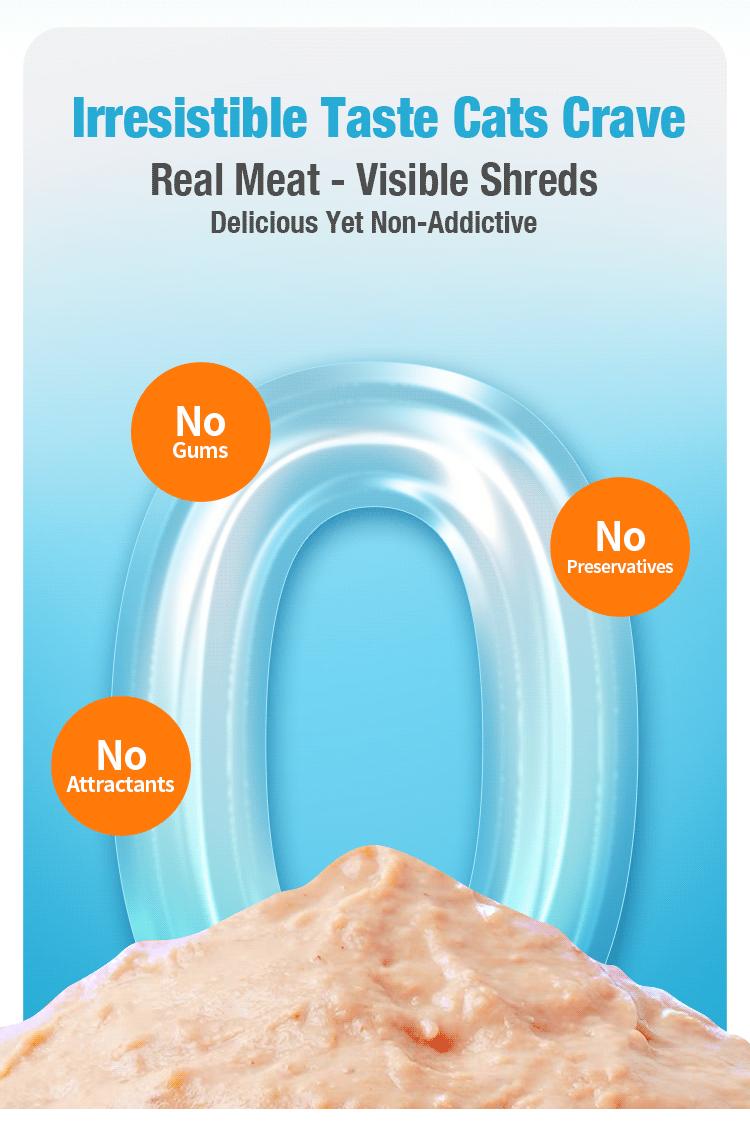 Crafted with fresh chicken, fish oil, and shrimp—every bite is packed with real, high-quality ingredients that even the pickiest cats can’t resist!Enriched with high-concentration Omega-3 from deep-sea fish oil, it supports shiny fur, vision health, and strong immunity. Made with no gums, no artificial attractants, and no preservatives, it’s gentle on sensitive stomachs and highly digestible (95% absorption rate). We use bone-in chicken thigh, liver, and heart to provide natural taurine, delivering complete daily nutrition for cats of all life stages.