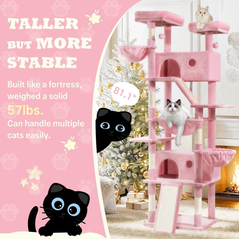 - STRUCTURAL UPGRADE: The cat tree now stands 81 inches tall, featuring a wider top perches and larger cat condos, specifically designed to support the activities of larger cats and multi-cat